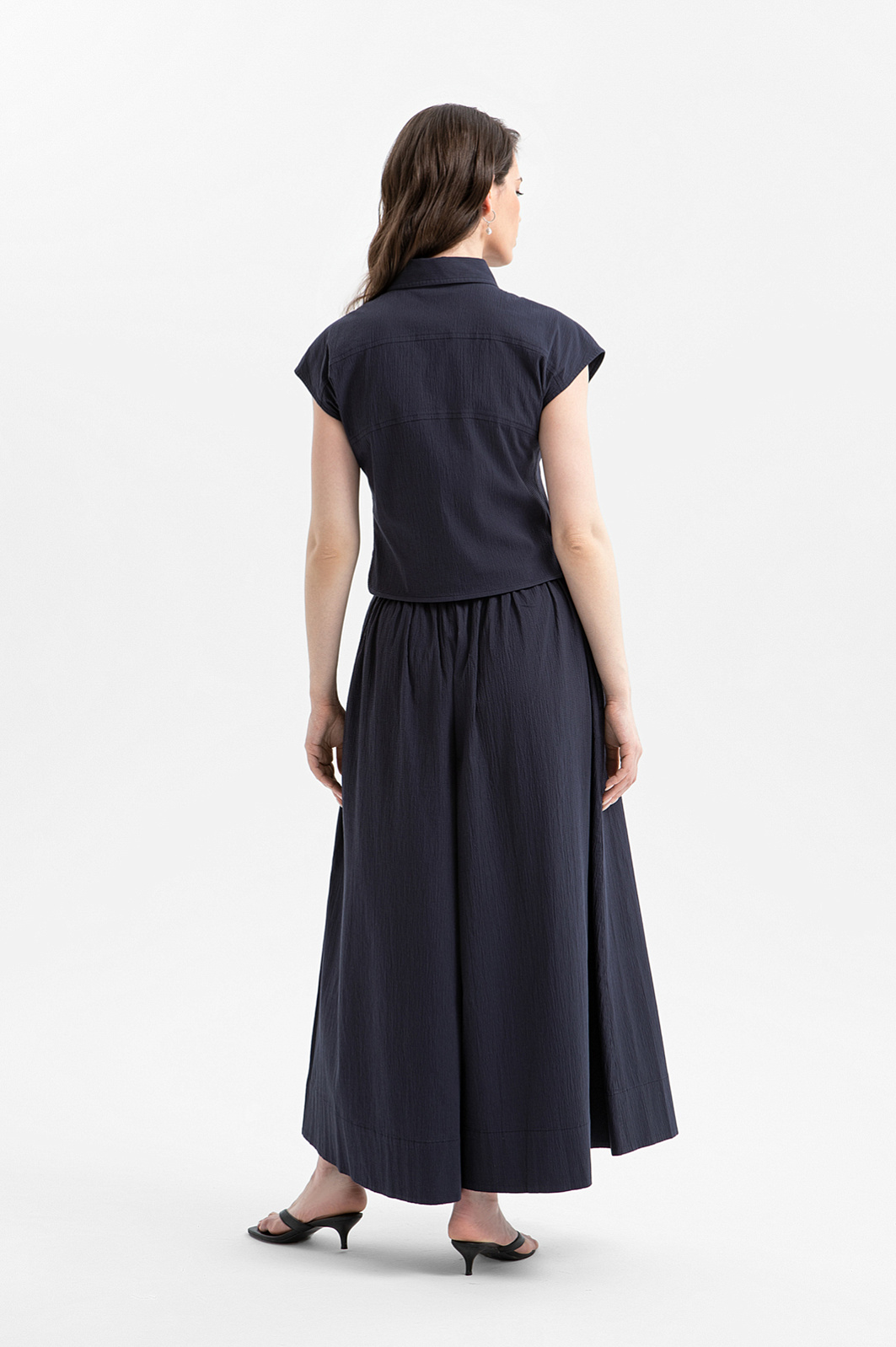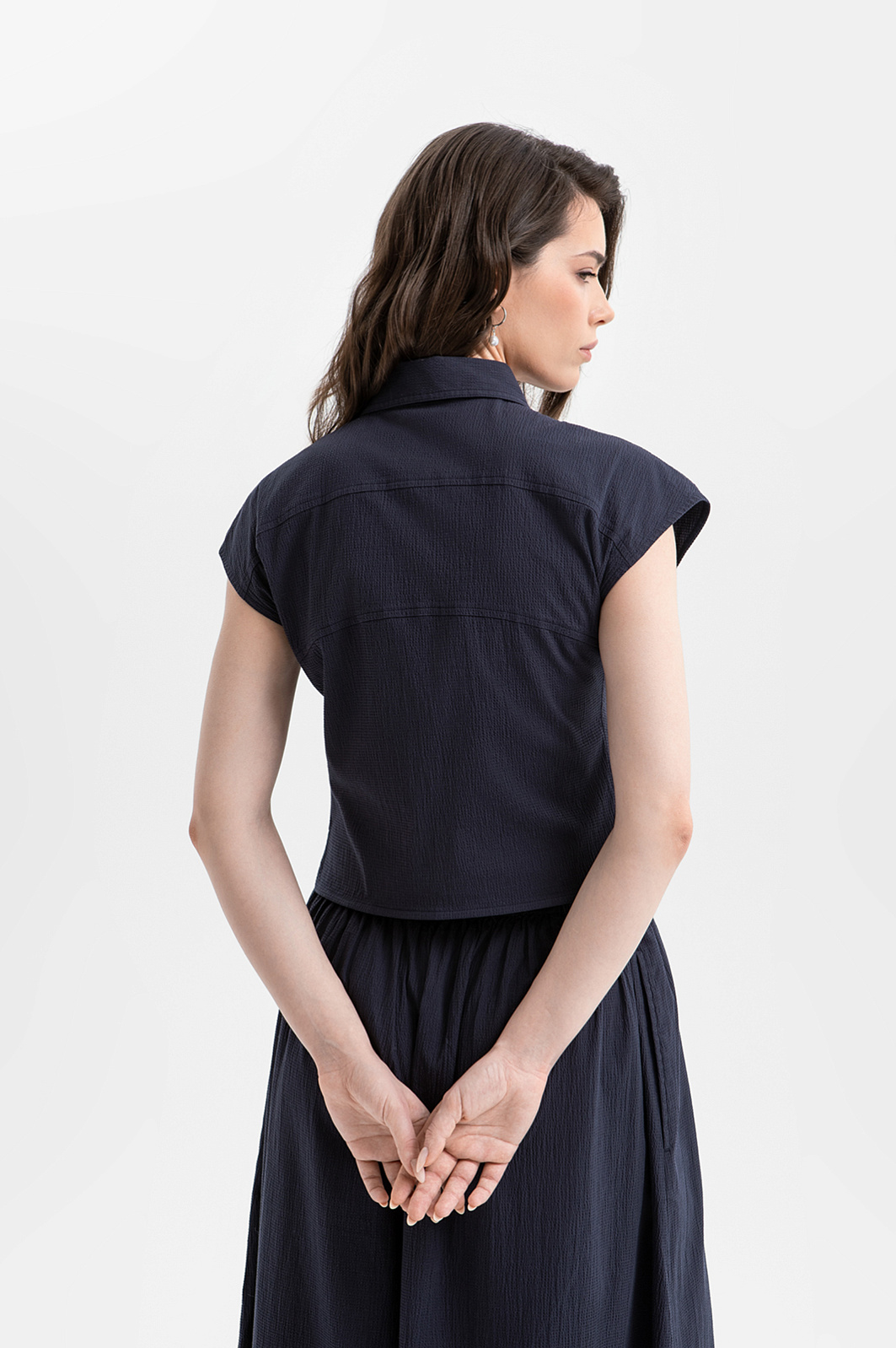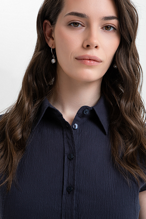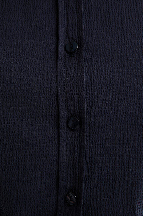 Блузка KANZLER глубокого синего цвета из хлопка с фактурным микроузором — универсальная вещь для создания повседневных и романтичных образов. Прилегающий крой подчеркивает женственность фигуры. Приспущенное плечо создаёт плавную закруглённую линию, которая делает силуэт более мягким. Ткань с деликатной микроячеистой текстурой обладает визуальной глубиной и выразительностью. Материал произведён из натурального хлопка. Его гипоаллергенные волокна хорошо пропускают воздух, поддерживая оптимальную для тела температуру. Небольшая добавка спандекса обеспечивает лёгкую эластичность ткани и делает посадку более комфортной.