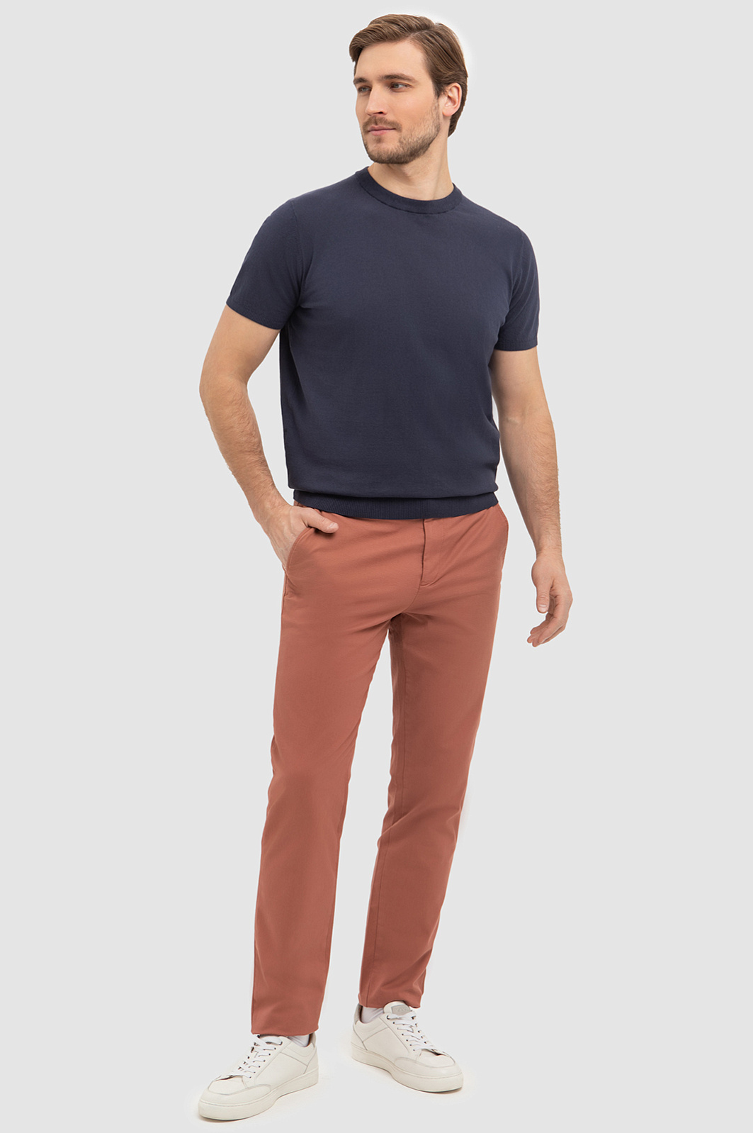 Яркий акцент в гардеробе – коралловые брюки из натурального хлопка. Приталенный крой подчеркивает фигуру, сохраняя свободу движений. Натуральный хлопок обеспечивает комфорт и свежесть в течение всего дня, а небольшой процент эластана — отличную посадку и необходимую эластичность. Коралловый цвет добавляет оригинальности и красочности в привычные образы, не перегружая их. Рекомендуем сочетать их с рубашками и легкими джемперами для создания нестрогого делового образа или с футболкой и кедами для расслабленного повседневного аутфита. Практичные, стильные и удобные брюки станут универсальным выбором как для работы, так и для отдыха. Параметры модели: рост 187, 100-81-97 Размер на модели: 50