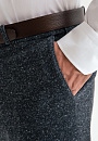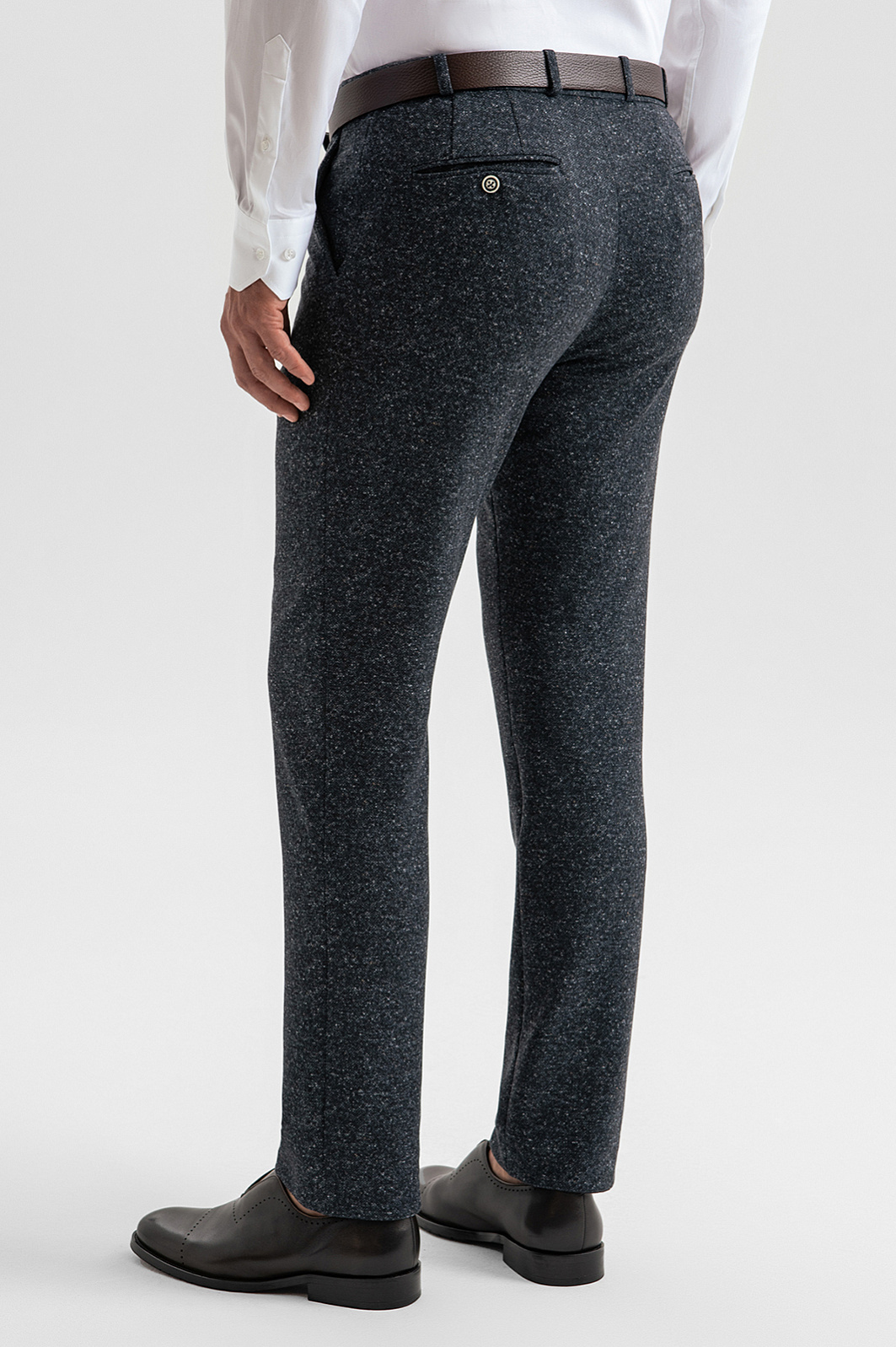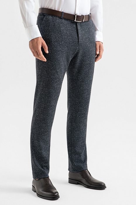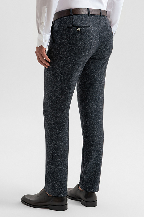 Брюки KANZLER из темно-серого смесового хлопкового трикотажа с белыми вкраплениями — модель для неофициальных выходов и создания стильных повседневных образов. Ткань мягко облегает тело, Приталенный силуэт визуально вытягивает фигуру, задавая вертикаль. Переплетение темно-серых и белых волокон придает ткани фактурность. Гипоаллергенные хлопковые волокна обеспечивают комфорт в носке. Полиэстер служит для прочности, а небольшое включение эластана сохраняет аккуратный вид. Гладкая износоустойчивая подкладка облегчает надевание. Параметры модели: рост 189, 102-80-99 Размер на модели: 50