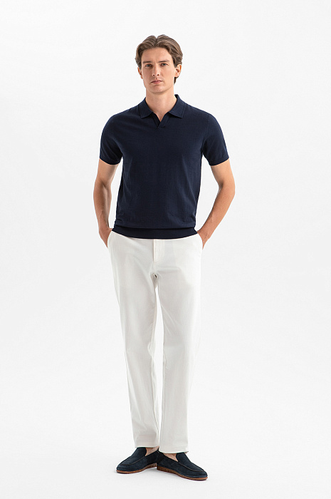 Поло KANZLER из 100% премиального хлопка Пима — стильная универсальная вещь для тёплых дней. Глубокий чернильный оттенок служит основой для повседневных образов в широком диапазоне — от деловых до вечерних аутфитов. Отложной воротник и небольшой треугольный вырез придают модели расслабленный характер, не выходя за рамки городской эстетики. Трикотажные резинки на рукавах и по низу формируют аккуратный силуэт. Эластичный трикотаж не ограничивает свободу движений. В составе материала — драгоценный хлопок Пима. Его длинные тонкие волокна создают ощущение мягкого нежного прикосновения и поддерживают идеальный микроклимат.