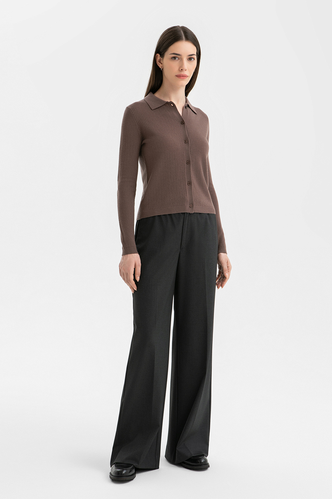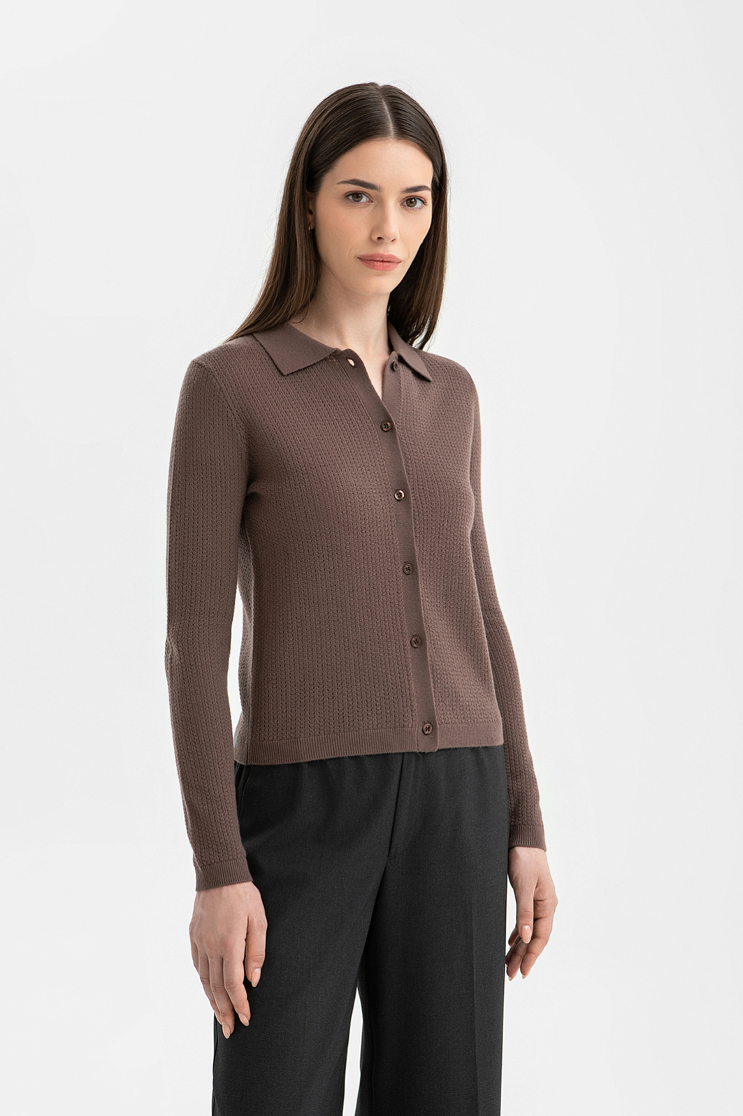 Кардиган KANZLER в оттенке мокко – гимн утонченной роскоши. Укороченная модель с отложным воротником создана из тонкого смесового материала. Шерсть высочайшего качества сохраняет тепло без перегрева, а кашемир добавляет ощущение нежности и мягкости, создавая эффект «второй кожи». Фактурная вязка придает образу глубину, а минималистичный крой делает модель универсальным выбором для делового и повседневного гардероба.