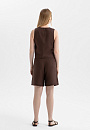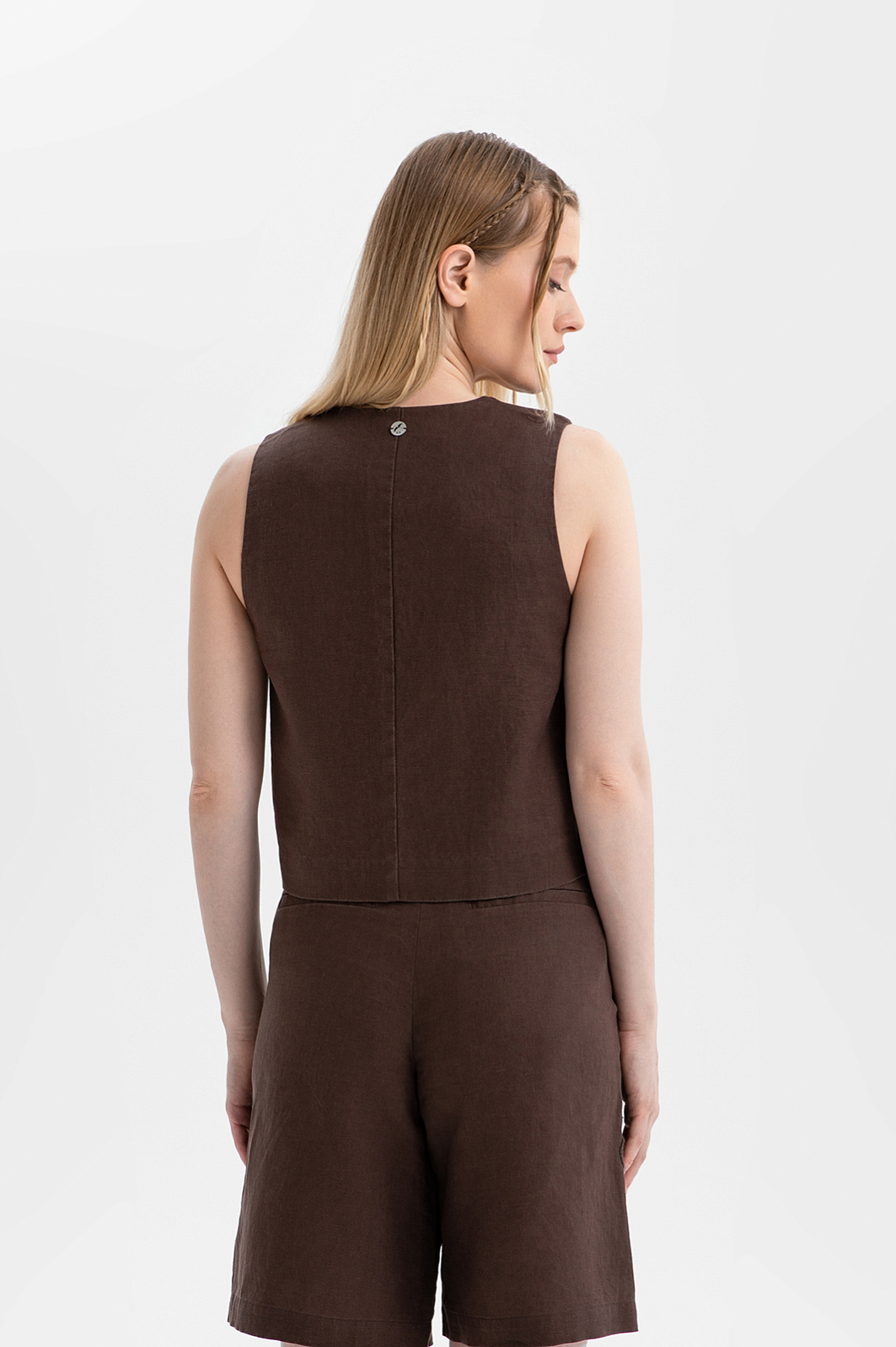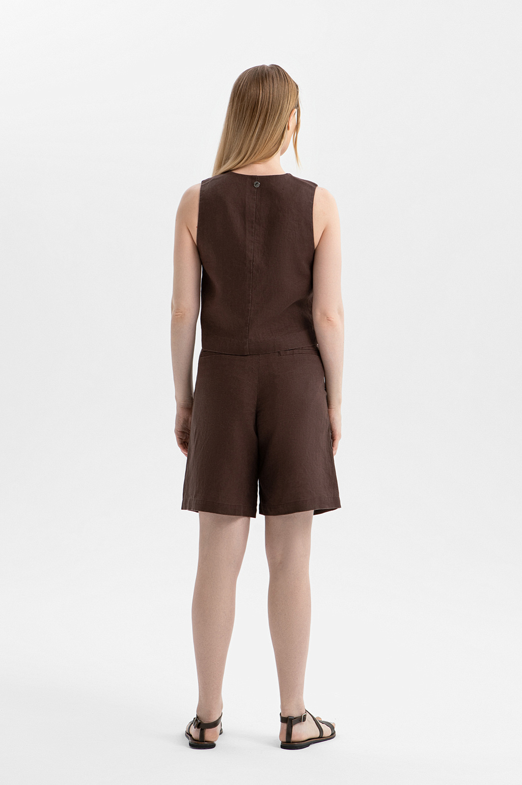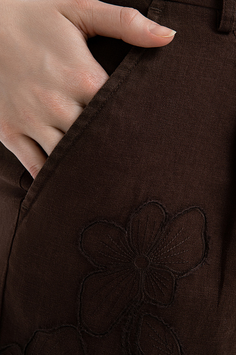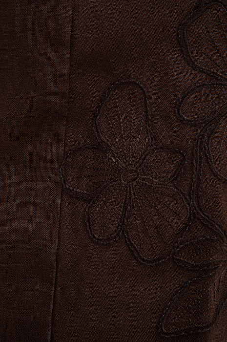Коричневый льняной костюм KANZLER с изящной цветочной вышивкой воплощает сдержанный этно-шик и непринуждённость летнего гардероба. В нём приятно бродить по улочкам южного города, заглядывая в сувенирные лавки и останавливаясь в аутентичных кафе, чтобы выпить чашечку жгучего кофе. Верхняя часть комплекта — лаконичный жилет на завязках, украшенных крупными бусинами. Низ представлен шортами умеренно свободного кроя с аккуратными защипами у пояса, которые формируют мягкие складки и обеспечивают аккуратную посадку. Материал — чистый лен, придающий полотну естественную структуру. Натуральные гипоаллергенные волокна отлично пропускают воздух и отводят влагу, сохраняя ощущение свежести даже в самые жаркие дни.