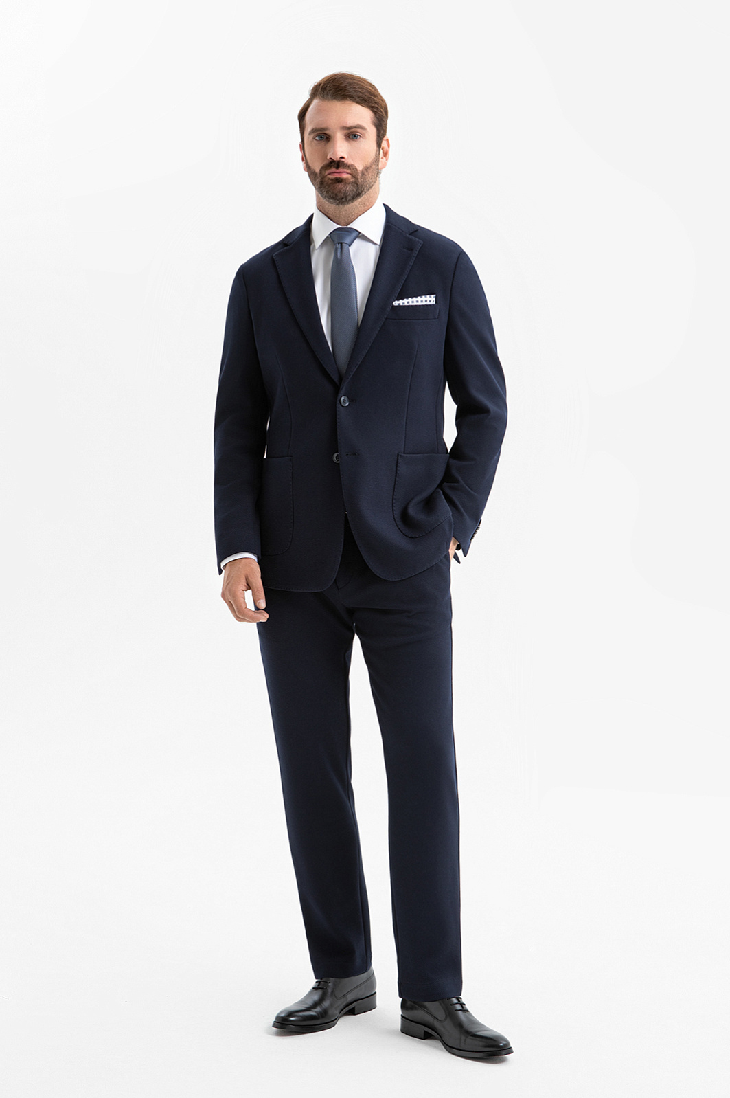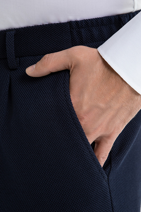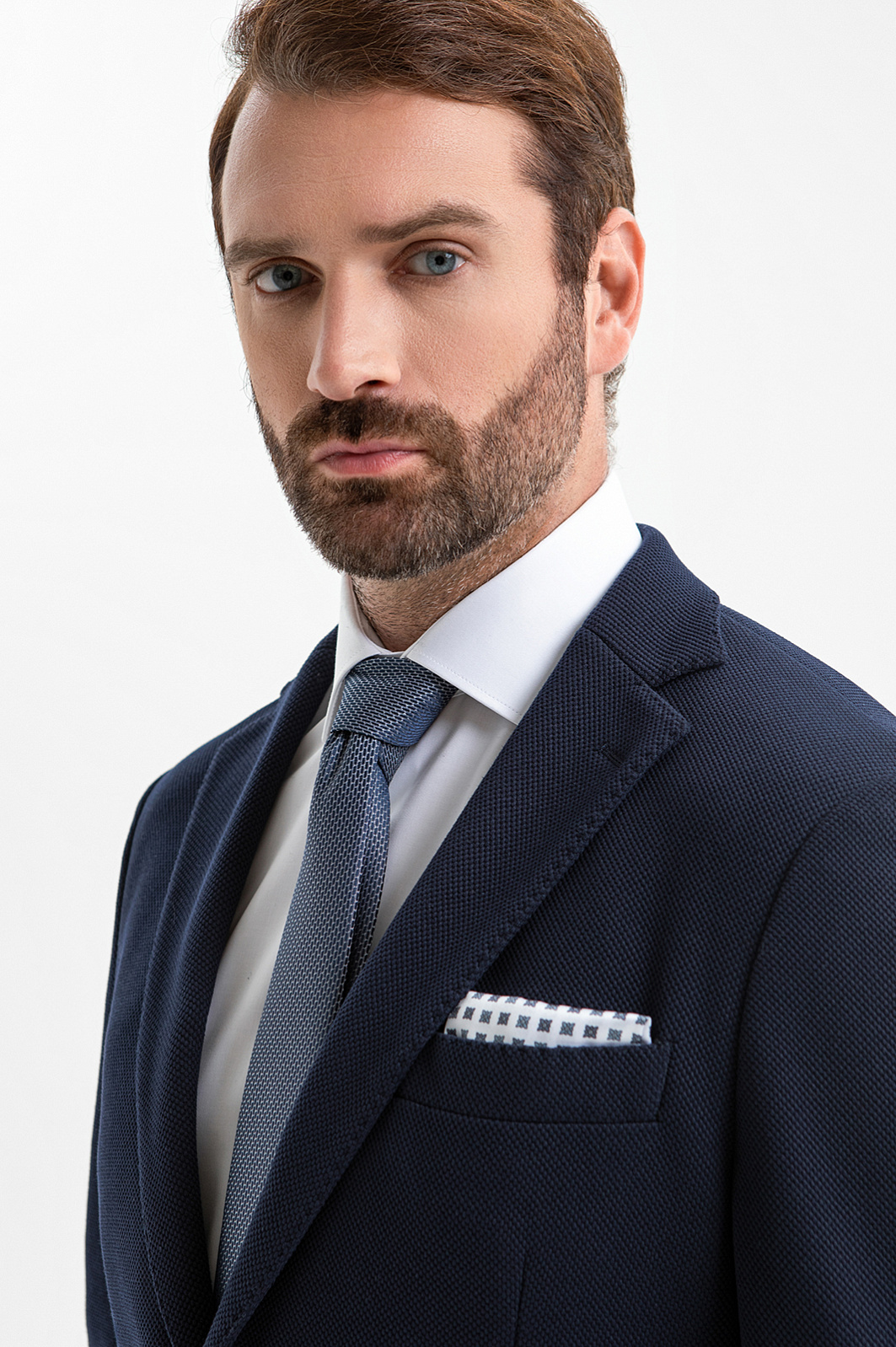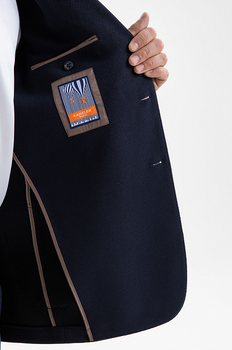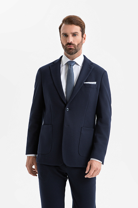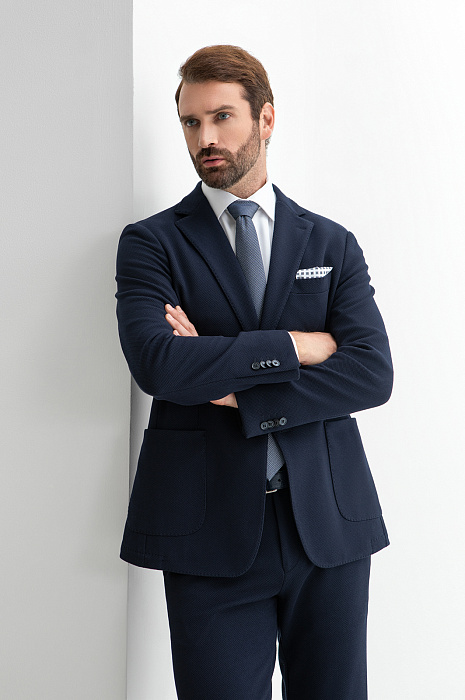Стильный тёмно-синий костюм-двойка KANZLER из текстурной ткани — удобная современная классика, которая придаёт уверенности в деловой среде и будет уместна в офисе, на встрече или презентации проекта. Практичная пара, составленная из облегчённого пиджака итальянского силуэта с умеренно широкими лацканами и слегка облегающих брюк на кулиске, создает гармоничные мужественные пропорции. Инновационная смесовая ткань выполнена из высокотехнологичного тенсела и гипоаллергенного натурального хлопка. Такой состав делает материал дышащим, приятным к телу и лёгким в уходе.