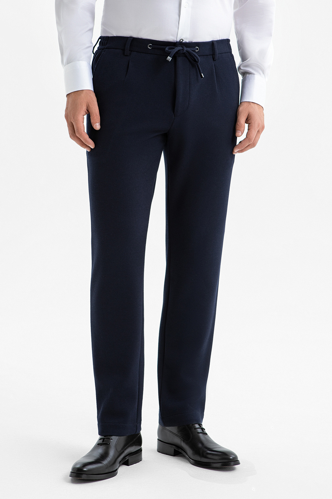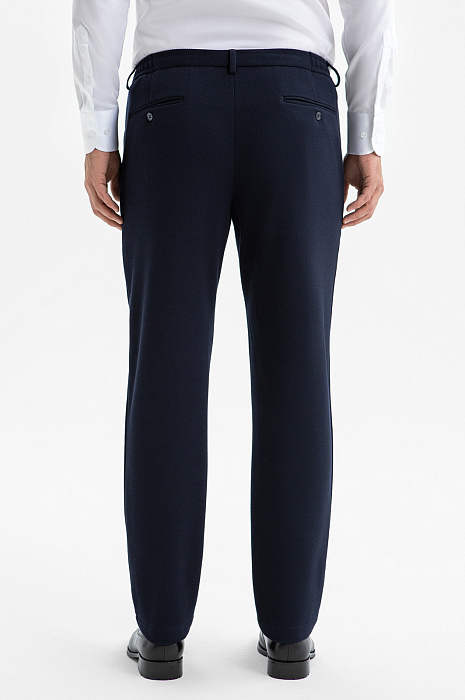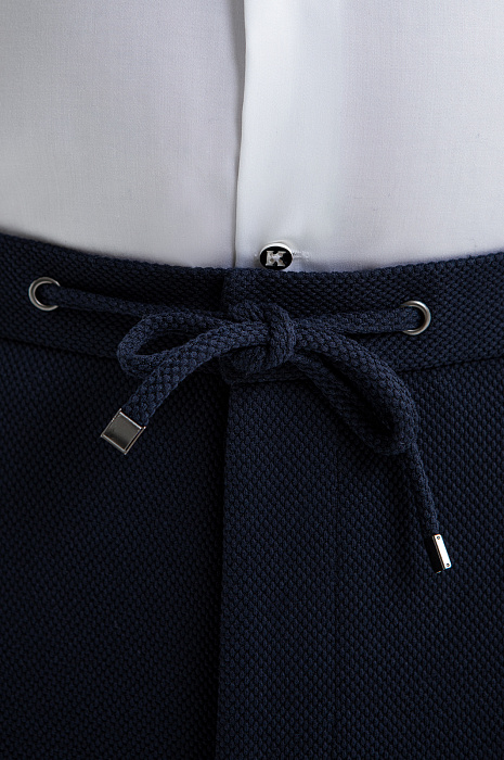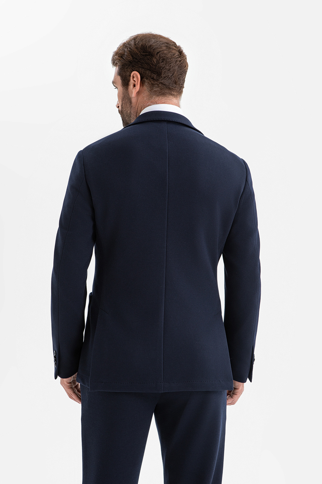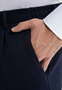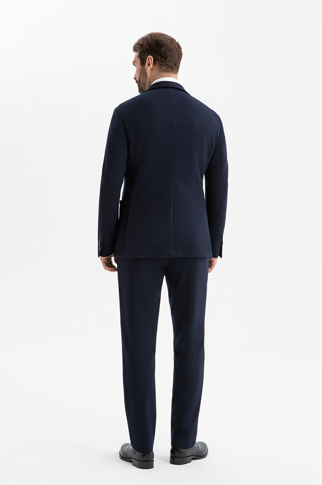 Стильный тёмно-синий костюм-двойка KANZLER из текстурной ткани — удобная современная классика, которая придаёт уверенности в деловой среде и будет уместна в офисе, на встрече или презентации проекта. Практичная пара, составленная из облегчённого пиджака итальянского силуэта с умеренно широкими лацканами и слегка облегающих брюк на кулиске, создает гармоничные мужественные пропорции. Инновационная смесовая ткань выполнена из высокотехнологичного тенсела и гипоаллергенного натурального хлопка. Такой состав делает материал дышащим, приятным к телу и лёгким в уходе.