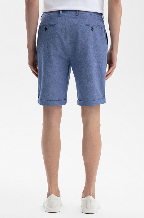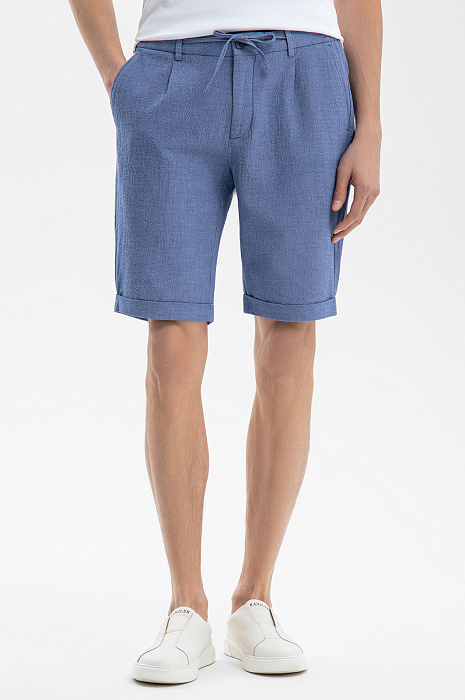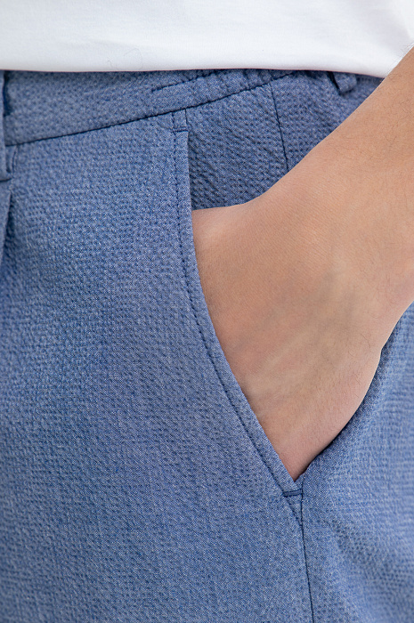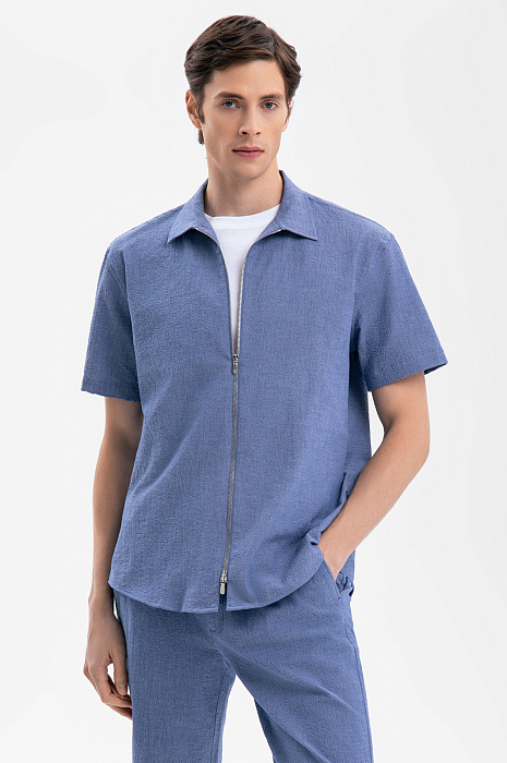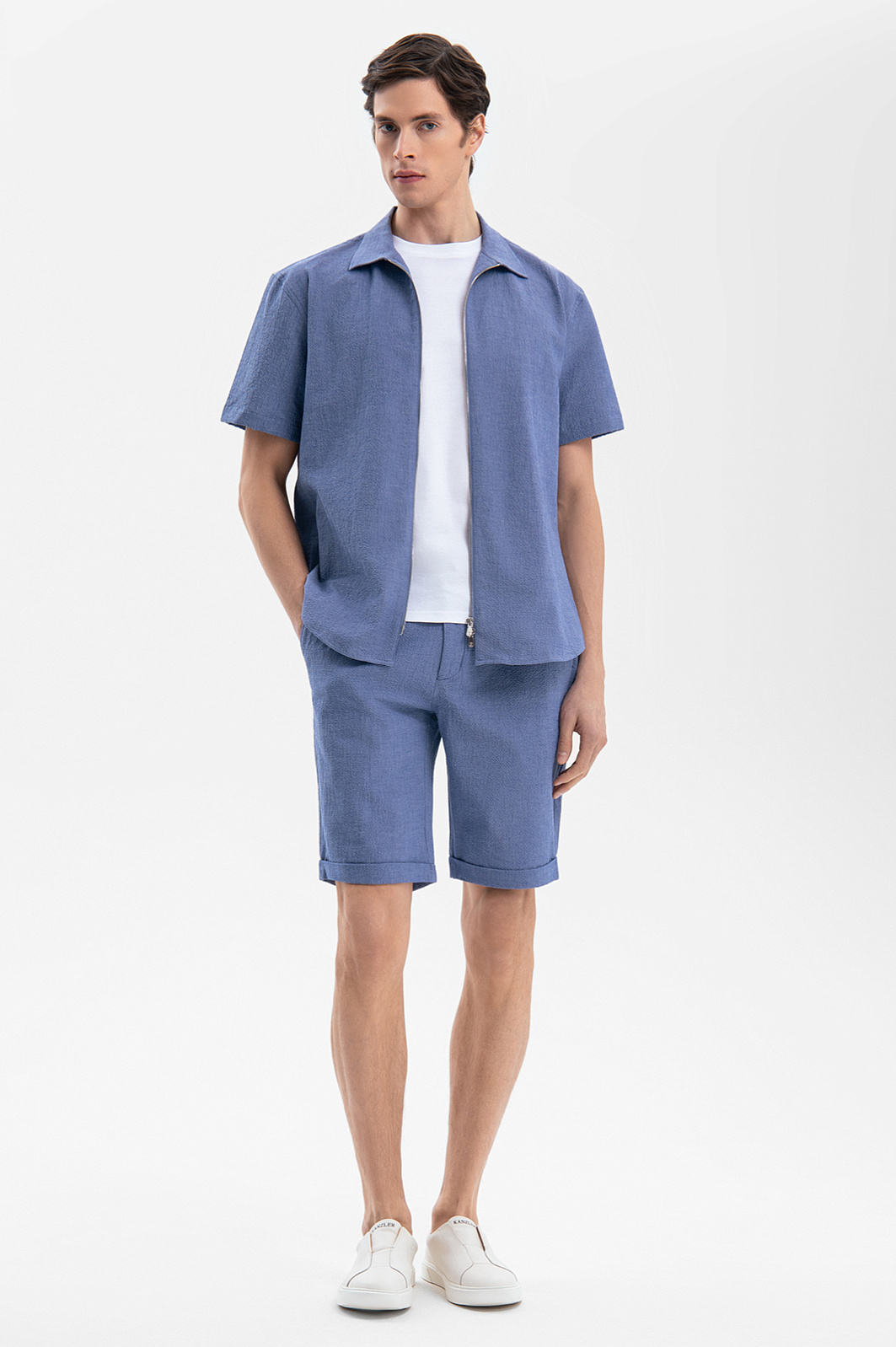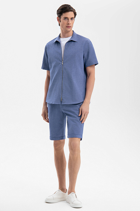 Современный летний костюм KANZLER красивого василькового оттенка из легкой фактурной хлопковой ткани из лимитированной коллекции — идеальное решение для расслабленного и непринужденного отдыха в теплые дни в городе и на курорте. Сорочка свободного кроя с коротким рукавом и двухзамковой молнией дополнена удобными бермудами на кулиске с карманами, небольшими защипами спереди и отворотами снизу. Мягкие натуральные гипоаллергенные волокна хлопка (97%) хорошо пропускают воздух и обеспечивают телу бескомпромиссный комфорт и свежесть. Небольшая добавка эластана (3%) служит для прочности и поддержания аккуратного вида костюма.