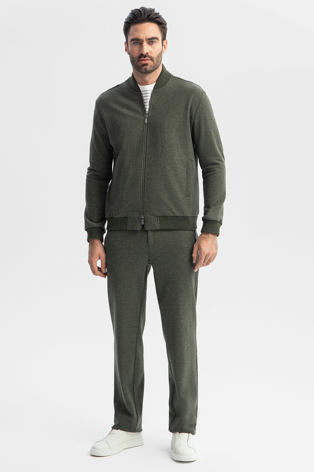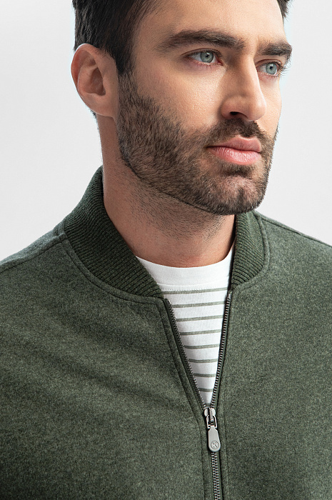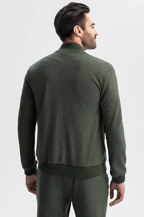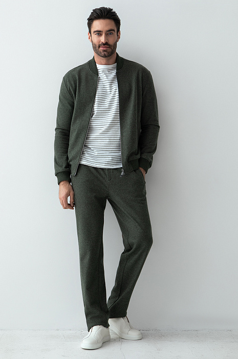 Удобный универсальный костюм KANZLER темно-зеленого цвета из лимитированной коллекции сшит из роскошного материала, произведенного легендарной итальянской мануфактурой Vitale Barberis Canonico, которая создает свои знаменитые ткани из шерсти с 17 века. Упругие натуральные волокна шерсти мериноса хорошо держат форму, сохраняют тепло и пропускают воздух. Костюм состоит из бомбера с двухзамковой молнией и широкими фактурными трикотажными резинками и брюк на кулиске свободного прямого кроя. Это суперкомфортные вещи с мягкой фактурой, в которых можно двигаться в своем темпе, исследуя мир и отдыхая в приятных местах.