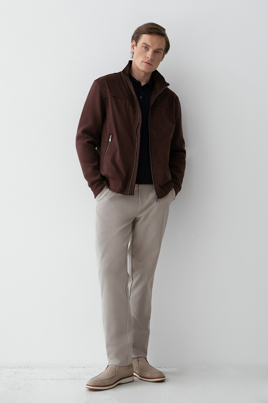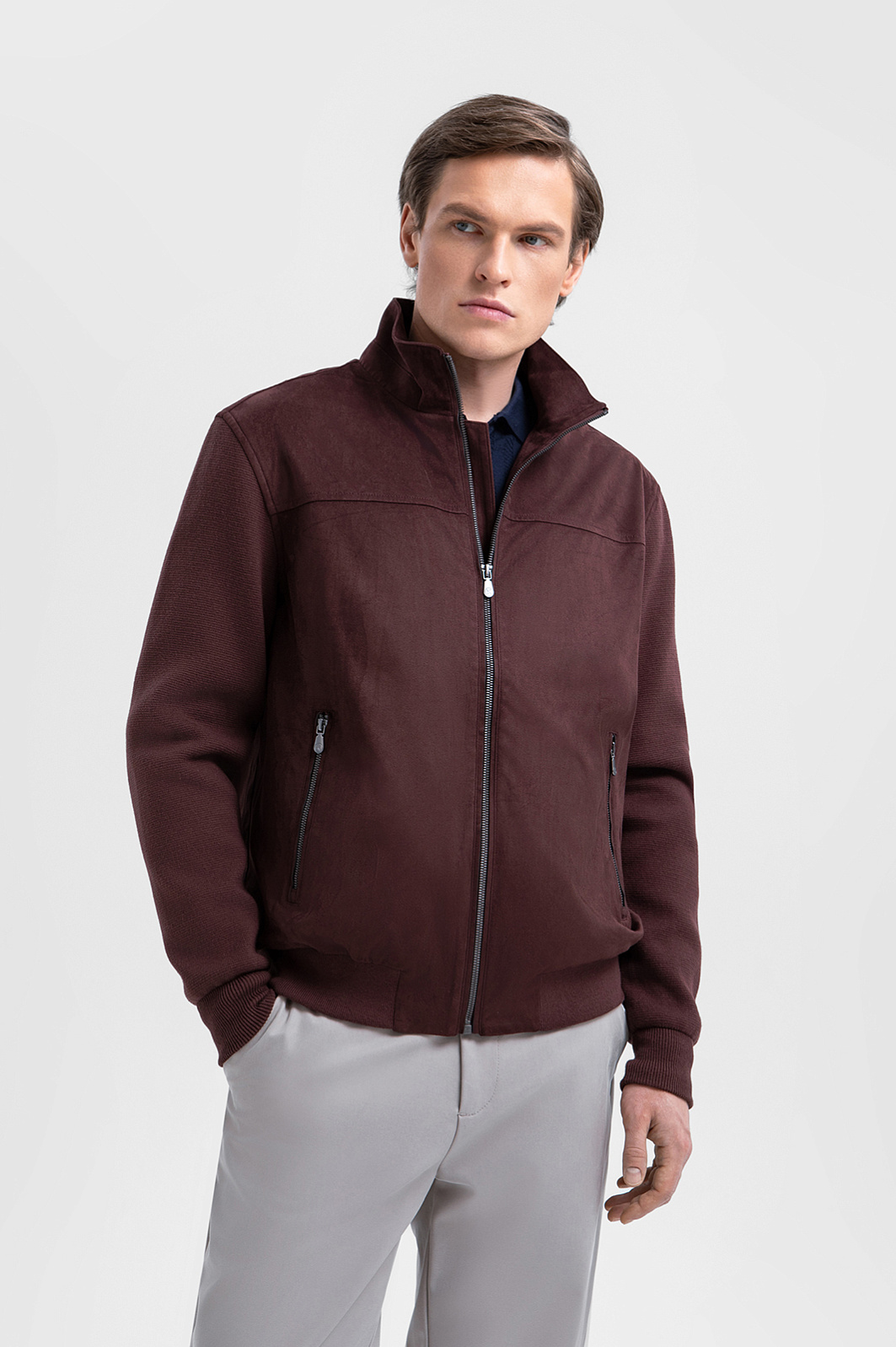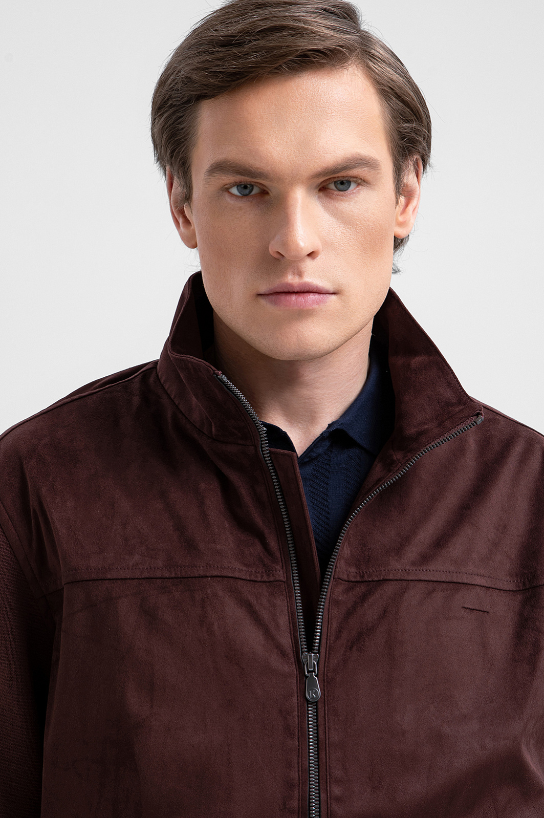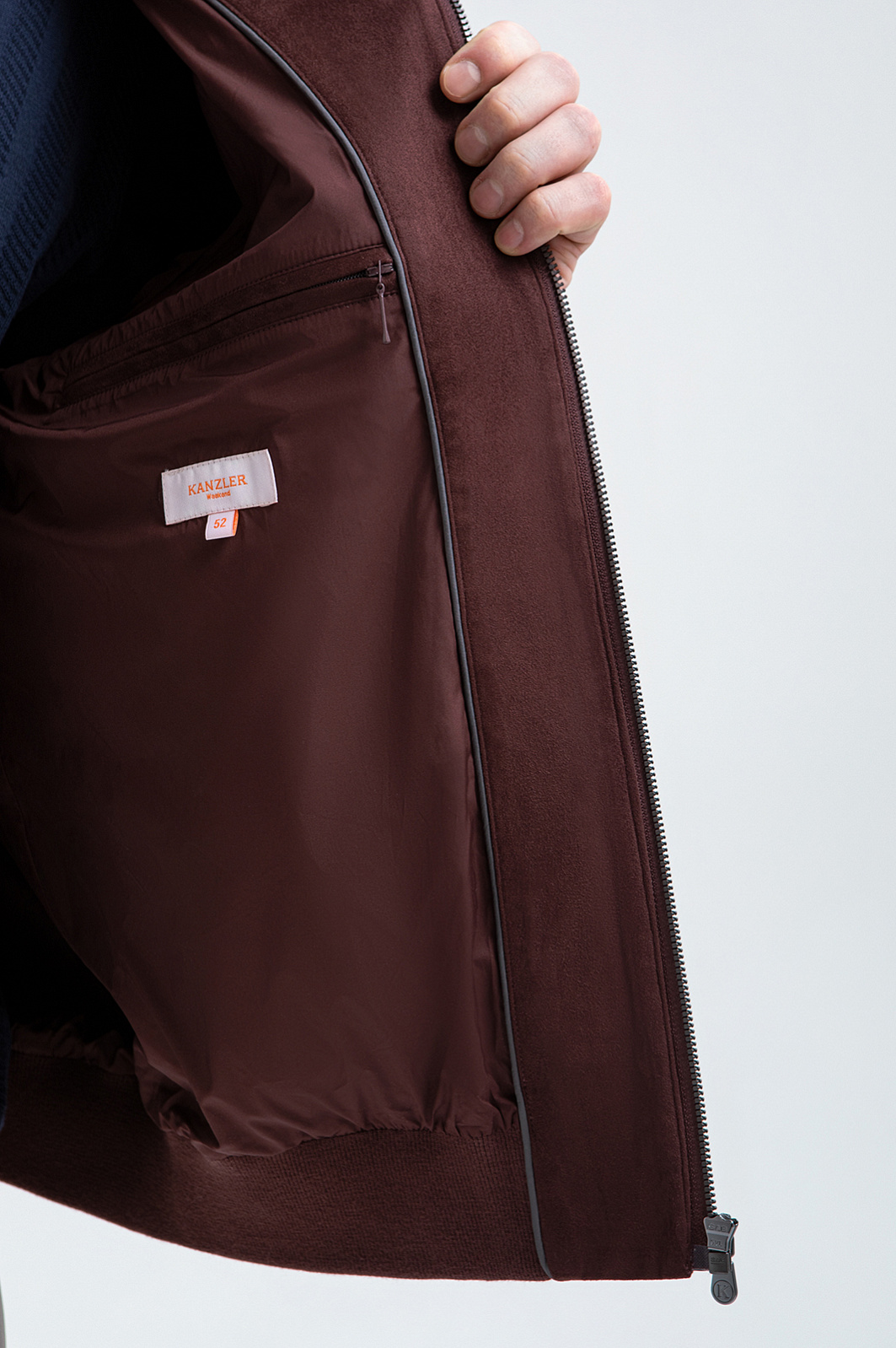Куртка KANZLER из алькантары в благородном шоколадном оттенке воплощает вневременную элегантность, объединяя изысканную замшевую фактуру с лаконичным сдержанным силуэтом. Крой бомбера дополнен высоким воротником, защищающим от ветра. Бархатистая и тёплая на ощупь ткань переда и спинки сочетается с рукавами из плотного фактурного хлопкового трикотажа. Застёжки-молнии добавляют образу нотку спортивного шика. Основная часть куртки выполнена из алькантары — уникального материала из прочного полиамида с добавлением спандекса, который устойчив к износу, хорошо держит форму и сохраняет аккуратный внешний вид даже при интенсивном использовании.