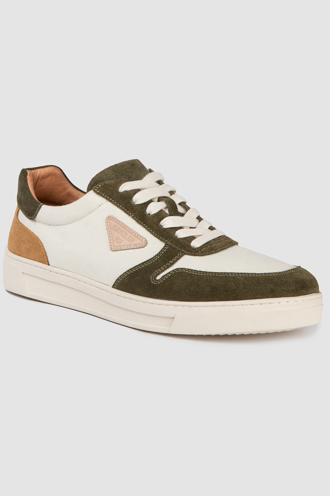 Белые стильные кеды KANZLER из практичного прочного текстиля украшены деталями из натуральной замши темно-оливкового и песочного оттенков и небольшим треугольником фирменной нашивки. В результате получился шедевр спортивной моды и современного урбанистического стиля. Подкладка и стелька из натуральной кожи обеспечивают воздухопроницаемость и комфорт. Утолщенная подошва из качественной плотной резины не стирается даже при длительной и повседневной ходьбе, обеспечивает устойчивость и уверенность при движении. В невероятно удобных кедах KANZLER можно не только легко пройти рекомендуемую дневную норму в 10 тысяч шагов, но и удвоить дистанцию.
