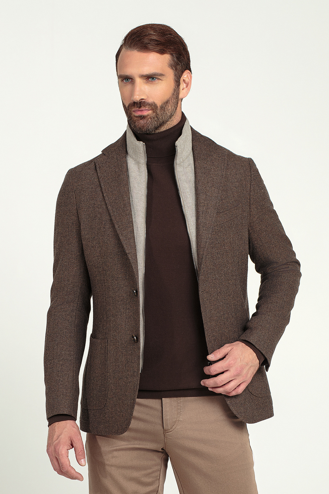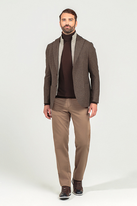 Пиджак из лимитированной коллекции из смесовой шерсти со съемным воротником-стойкой — элегантный и практичный предмет мужского гардероба. Пиджак выполнен из плотного смесового материала с тройным переплетением нитей из мягкой шерсти, полиэстера и акрила. Материал обеспечивает приятные тактильные ощущения и эстетичный внешний вид, прекрасно сохраняет тепло. Подкладка из вискозы и полиэстера добавляет мягкости и комфорта, а съемная манишка служит для дополнительного утепления и придает изделию кежуал стиль. Комфортный классический силуэт обеспечивает свободную посадку и не сковывает движений. Благородный коричневый оттенок прекрасно сочетается с другими элементами гардероба: приглушает яркие, выделяет светлые оттенки и благородно смотрится с темными. Наши стилисты рекомендуют дополнить комплект теплой водолазкой в оттенке горького шоколада и светлыми брюками. Параметры модели: рост 189, 102-80-99 Размер на модели: 50