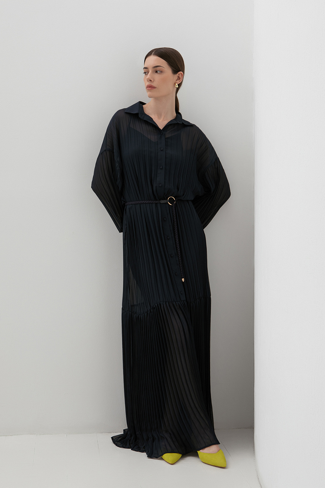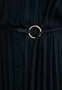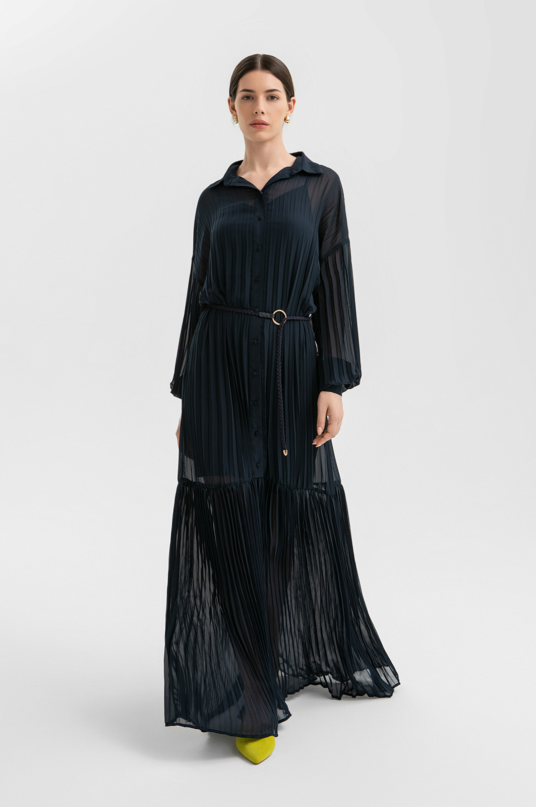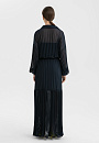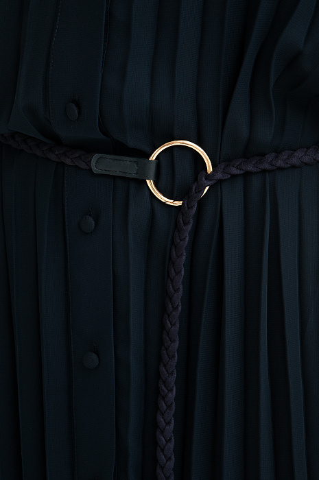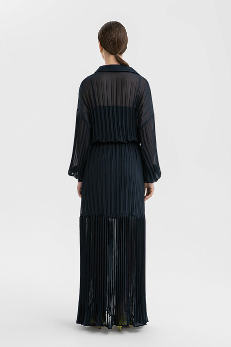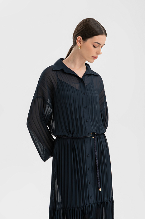 Длинное женственное тёмно-синее платье KANZLER выполнено из полупрозрачной ткани, которая красиво движется при ходьбе. Его утонченная элегантность и шик требуют особого повода — свидания или выхода в свет по случаю торжества, ужина в ресторане или театральной премьеры. Внешняя ткань создаёт эффект многослойности и романтичного флёра. Разные виды плиссировки — крупные складки в верхней части и изящные мелкие снизу — создают увлекательную игру фактур. Отложной воротник, спущенное плечо, аккуратная планка с пуговицами и изящные манжеты на рукавах придают модели завершенность и утончённость. Регулируемый пояс-косичка с золотистой фурнитурой подчеркивает линию талии. Короткое внутреннее платье обеспечивает комфорт и необходимую непрозрачность. Материал верха создан из лёгкого прочного полиэстера. Нижний слой — из полиэстера с добавлением эластана.