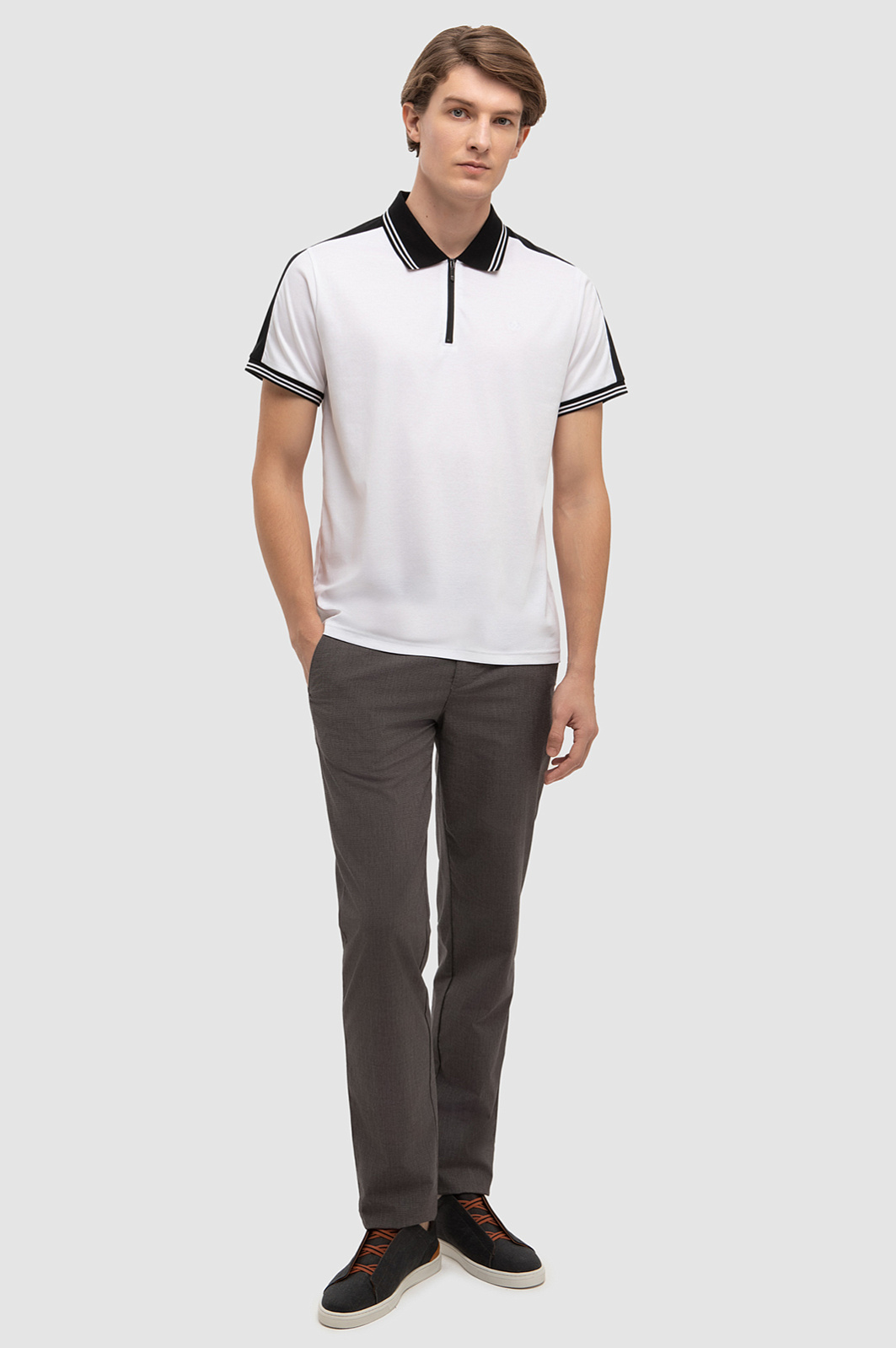 Поло с отложным воротником - главный фаворит современной моды, ставший классикой мужского гардероба. Белоснежное поло прямого кроя выглядит ярче и графичнее благодаря отделке черным цветом на воротнике, рукавах и манжетах изделия. Благородное черно-белое сочетание смотрится демократично и гармонично сочетается как с кежуал джинсами, так и с более деловыми моделями брюк. Дизайнеры выполнили модель из мягкого, прочного, но легкого и приятного на ощупь натурального хлопка. Поло KANZLER надолго сохраняет безупречный внешний вид, позволяя коже дышать. В качестве дополнительного декора - молния с фирменной буквой K. Параметры модели: рост 191, 97-77-99 Размер на модели: M