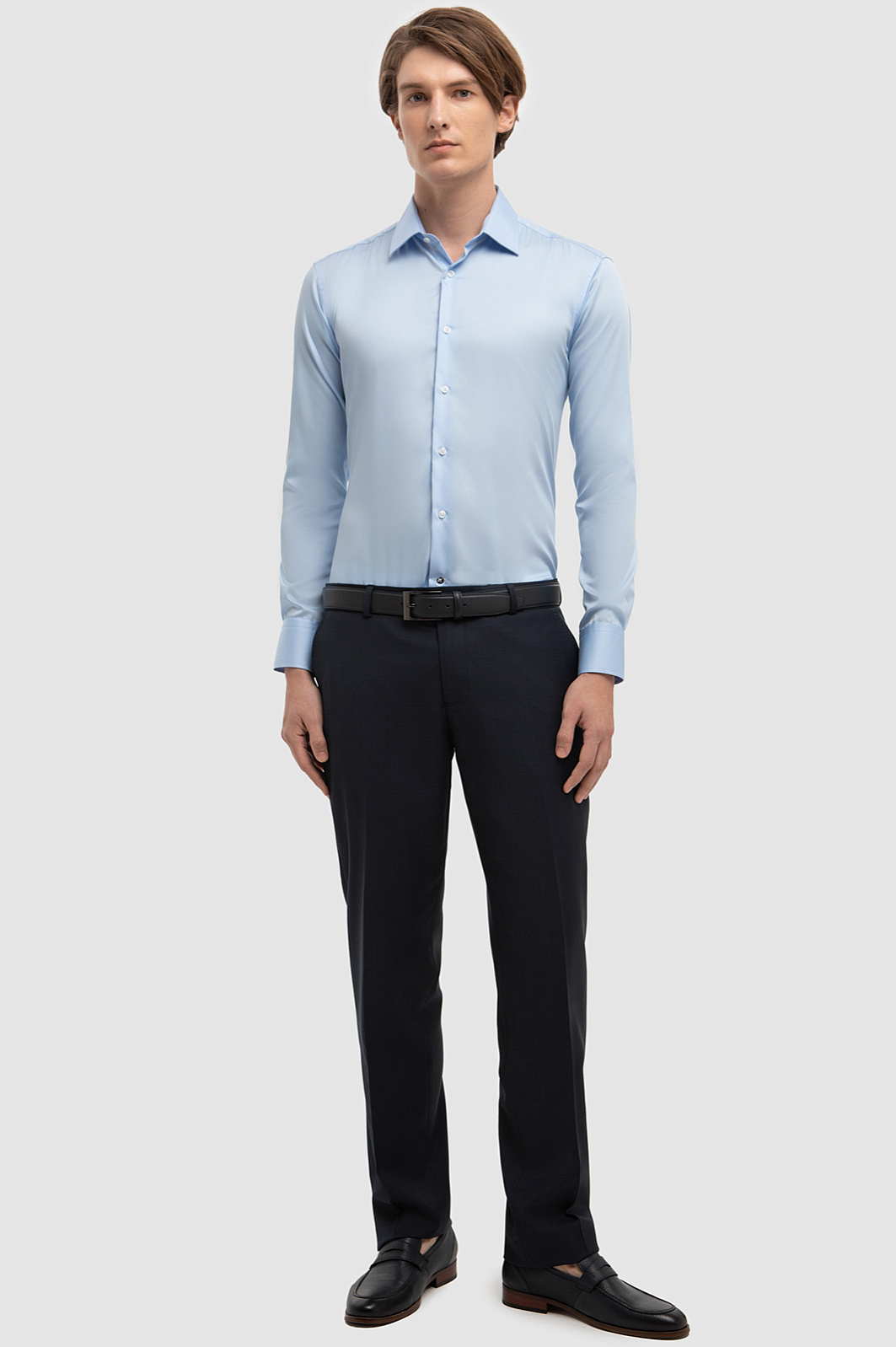 Для пошива приталенной сорочки дизайнеры KANZLER выбрали тонкую хлопковую ткань, которая обеспечивает отличную воздухопроницаемость, мягкость и комфорт в течение всего дня. Нейтральный голубой цвет гладкого текстиля стал идеальной основой для повседневных деловых образов, прекрасно заменяя классическую белую рубашку в деловых ансамблях. Специальная технология легкой утюжки приятно удивит и обеспечит простоту в уходе, сохраняя безупречный вид изделия с минимальными усилиями. Пастельный голубой цвет становится более выразительным в сочетании с синим или белым цветом и позволяет создавать разнообразные стильные комбинации. Наши стилисты советуют комбинировать сорочку с темно-синими пиджаком, брюками и аксессуарами в тон, чтобы создать завершенный деловой образ. Параметры модели: рост 191, 97-77-99 Размер на модели: 40