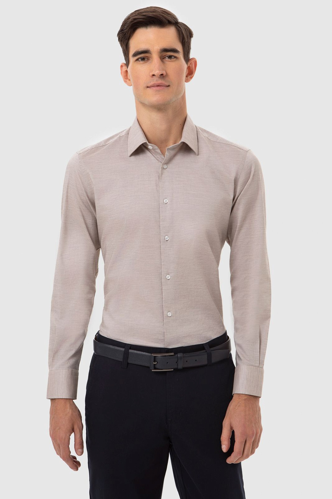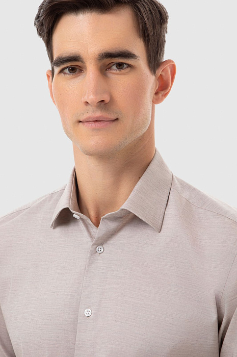 Сорочка - незаменимый элемент делового мужского стиля. Серо-бежевая сорочка с классическим воротником снизит градус формальности образа с деловым костюмом и сможет подружиться с кежуал брюками. Для пошива модели использовали тонкую ткань из отборного хлопка с шероховатой фактурой. Легкий дышащий материал сохранит свежий вид на весь день и обеспечит комфорт в течение дня. Наши стилисты предлагают дополнить пастельный оттенок изделия однотонными вещами: темно-синими брюками песочными топсайдерами. Параметры модели: рост 192, 101-76-97 Размер на модели: 40