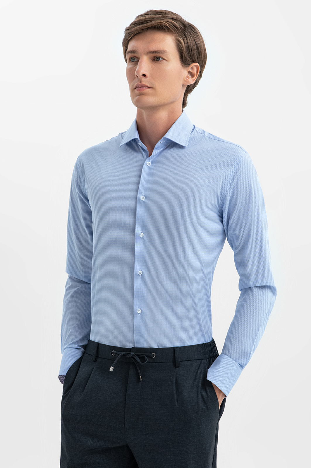 Сорочка KANZLER в мелкую голубую клетку — универсальная модель для создания образов в стилях умный кежуал и бизнес кежуал, которая подойдет для офиса, неофициальных встреч и городских прогулок. Легкая мягкая ткань из чистого хлопка поддержит рабочий настрой и хорошее самочувствие в течение всего дня. Гипоаллергенные воздухопроницаемые волокна сохраняют свежесть и приятную для тела температуру. Практичный свободный крой не сковывает движений и хорошо смотрится на любом типе фигуры. Комфортный вариант для работы и отдыха. Параметры модели: рост 191, 97-77-99 Размер на модели: 40