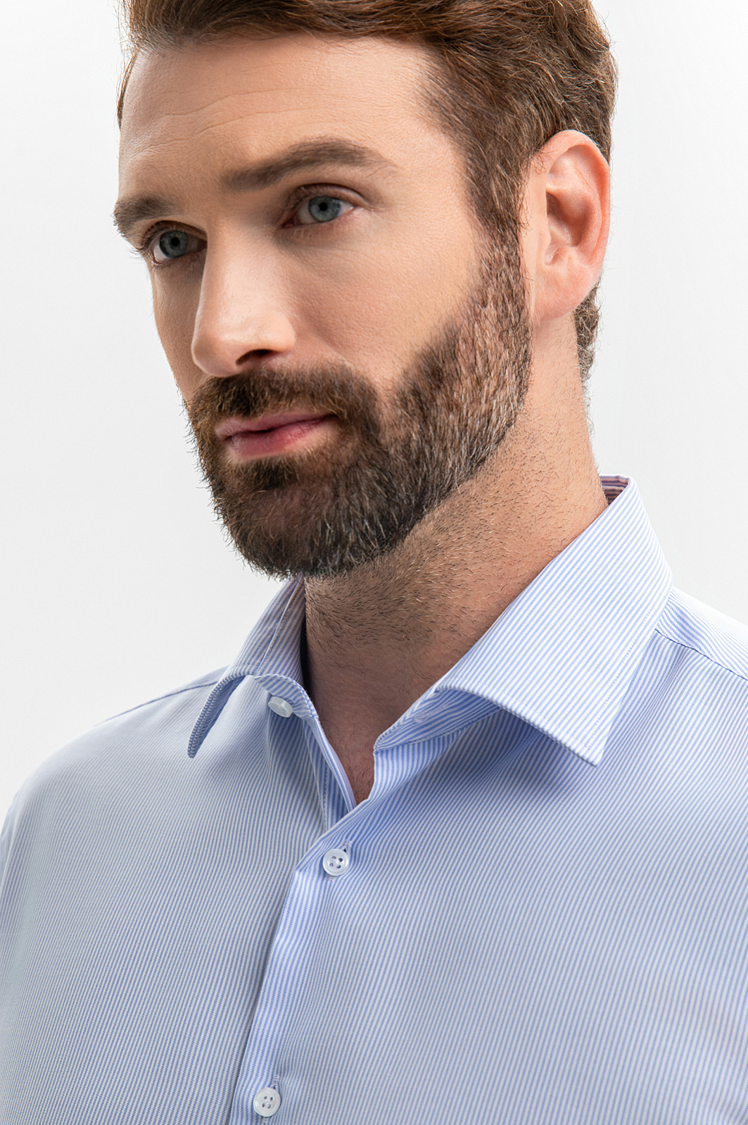 Сорочка KANZLER из чистого хлопка в голубую полоску — вневременная офисная классика. Она транслирует уверенность и принадлежность к деловому миру. Приталенный силуэт делает акцент на плечах и линии талии. Шлица на рукаве украшена синим фирменным инициалом. Модель безупречного качества сшита из 100-процентного хлопка — легкого гипоаллергенного дышащего материала, который сохраняет свежесть надолго и не раздражает кожу. Именно поэтому сорочка из хлопка — та вещь, которую носят с удовольствием. Параметры модели: рост 189, 102-80-99 Размер на модели: 40