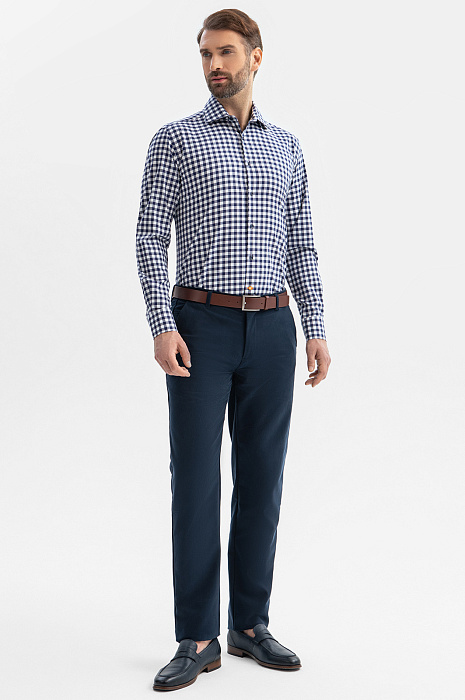 Сорочка KANZLER из чистого хлопка в синюю клетку украсит повседневный образ. Клетка — один из вечных трендов. Универсальная модель слегка прилегающего кроя сочетается со строгими и неформальными брюками и джинсами. Воротник с неострыми углами отворотов позволяет повязывать галстук широким узлом. Мягкая натуральная ткань из гипоаллергенных волокон хлопка обладает ценными свойствами — «дышит», долго сохраняет свежесть и поддерживает оптимальную для тела температуру. Параметры модели: рост 189, 102-80-99 Размер на модели: 40