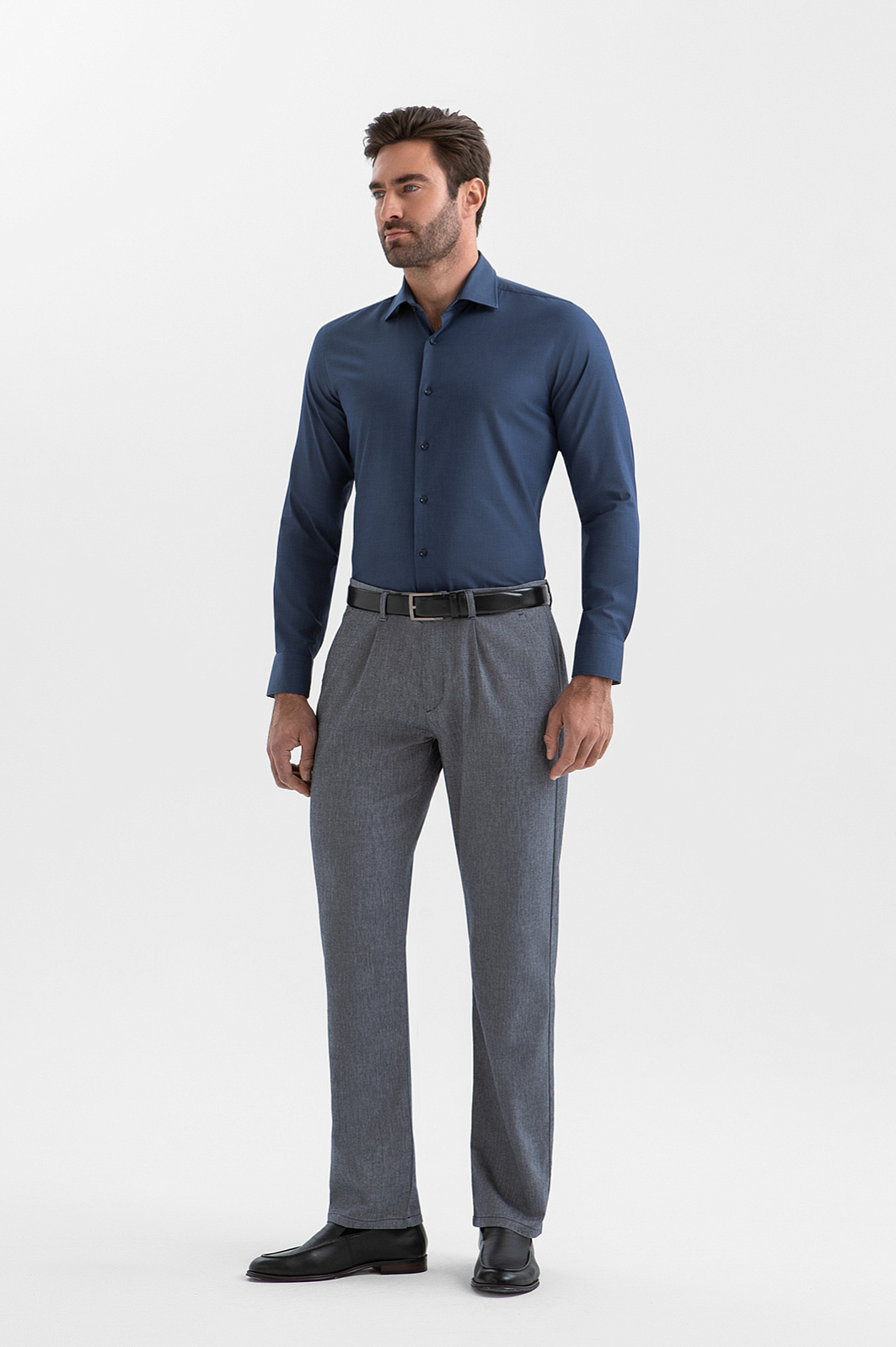 Сорочка KANZLER сумеречно-синего оттенка — воплощение сдержанной элегантности, шика и безупречного вкуса. Глубокий благородный цвет гармонично сочетается как с деловыми костюмами, так и с менее формальными повседневными вещами. Зауженный крой мягко обрисовывает контуры тела. Французская планка подчёркивает лаконичную простоту модели. Натуральный материал произведён старинной итальянской мануфактурой Tessitura Carlo Bassetti, которая специализируется на производстве роскошных рубашечных тканей. Гипоаллергенное полотно из хлопка (96%) отличается мягкостью и воздухопроницаемостью. Добавление эластана (4%) придаёт ему лёгкую эластичность и помогает сохранять форму.
