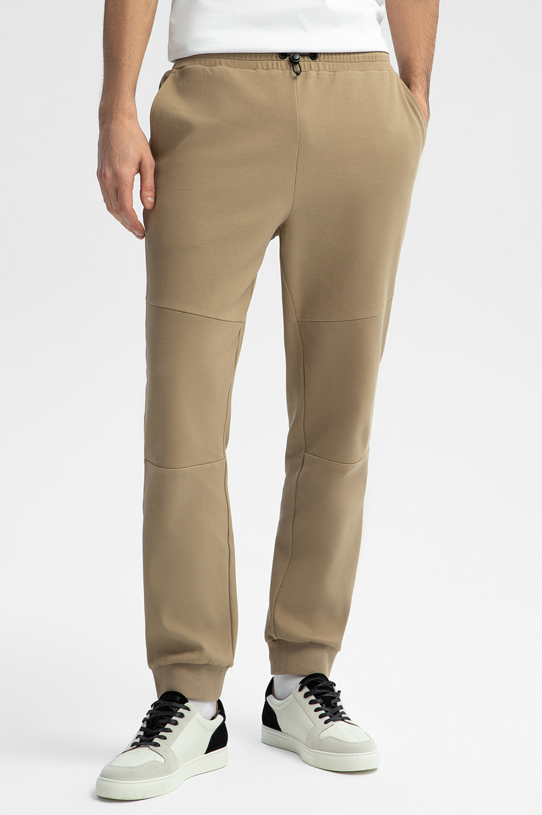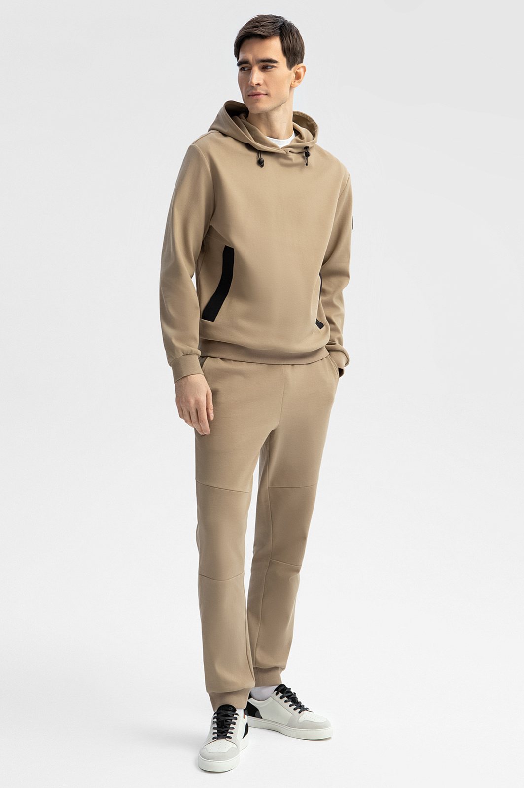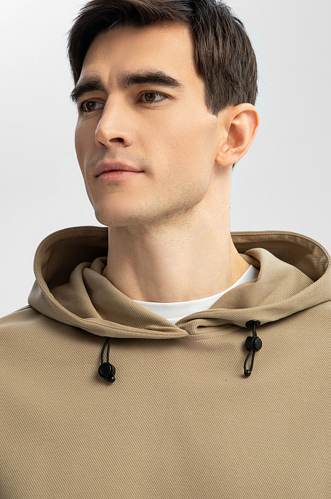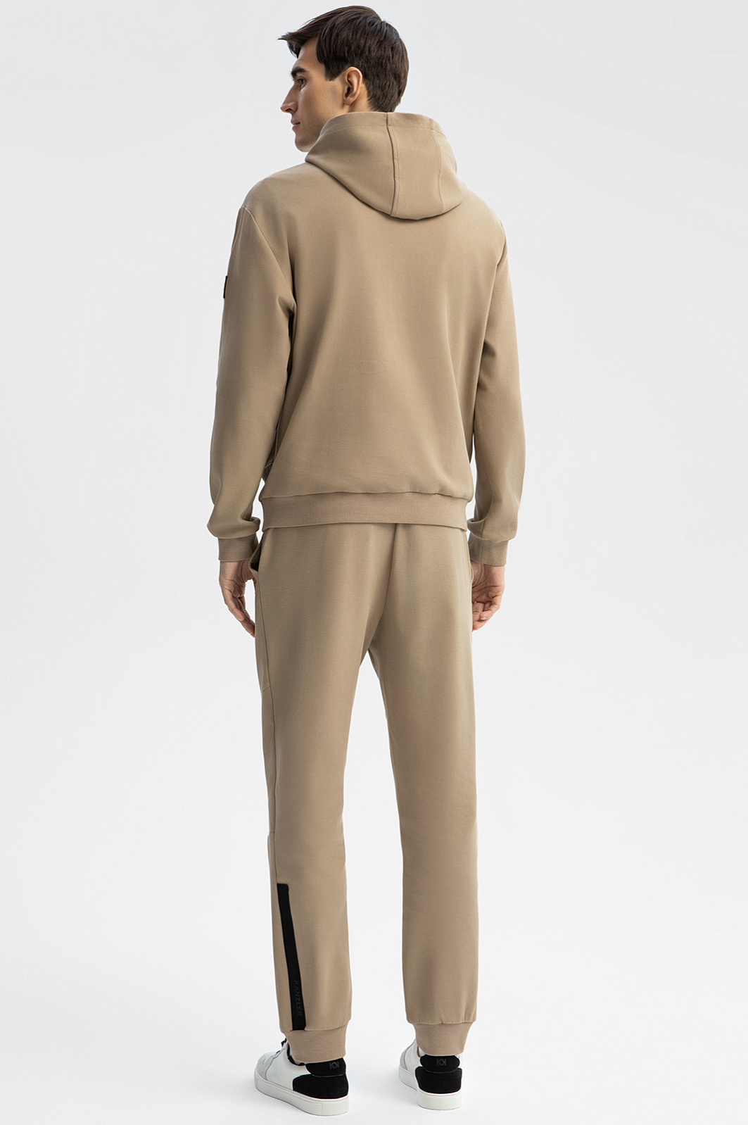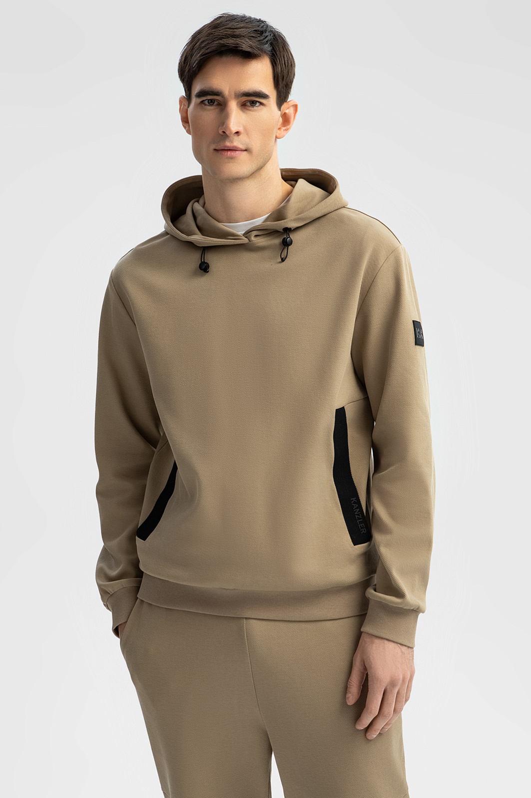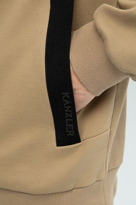 Спортивный костюм KANZLER из бежевой хлопковой ткани в диагональный рубчик с контрастными деталями — удобная одежда для свободного времени, когда можно сполна насладиться любимыми занятиями и активным отдыхом. Плотные широкие трикотажные резинки отлично придерживают края толстовки и низ брюк. При ветреной погоде шнурок с фиксатором позволяет плотнее затягивать капюшон. Фиксатор на брюках служит для регулирования объема талии. Пара сшита из натурального дышащего гипоаллергенного хлопка (89%) с добавлением полиэстера. Смесовой материал не боится капризов погоды, испытания временем и сохраняет естественное тепло тела.