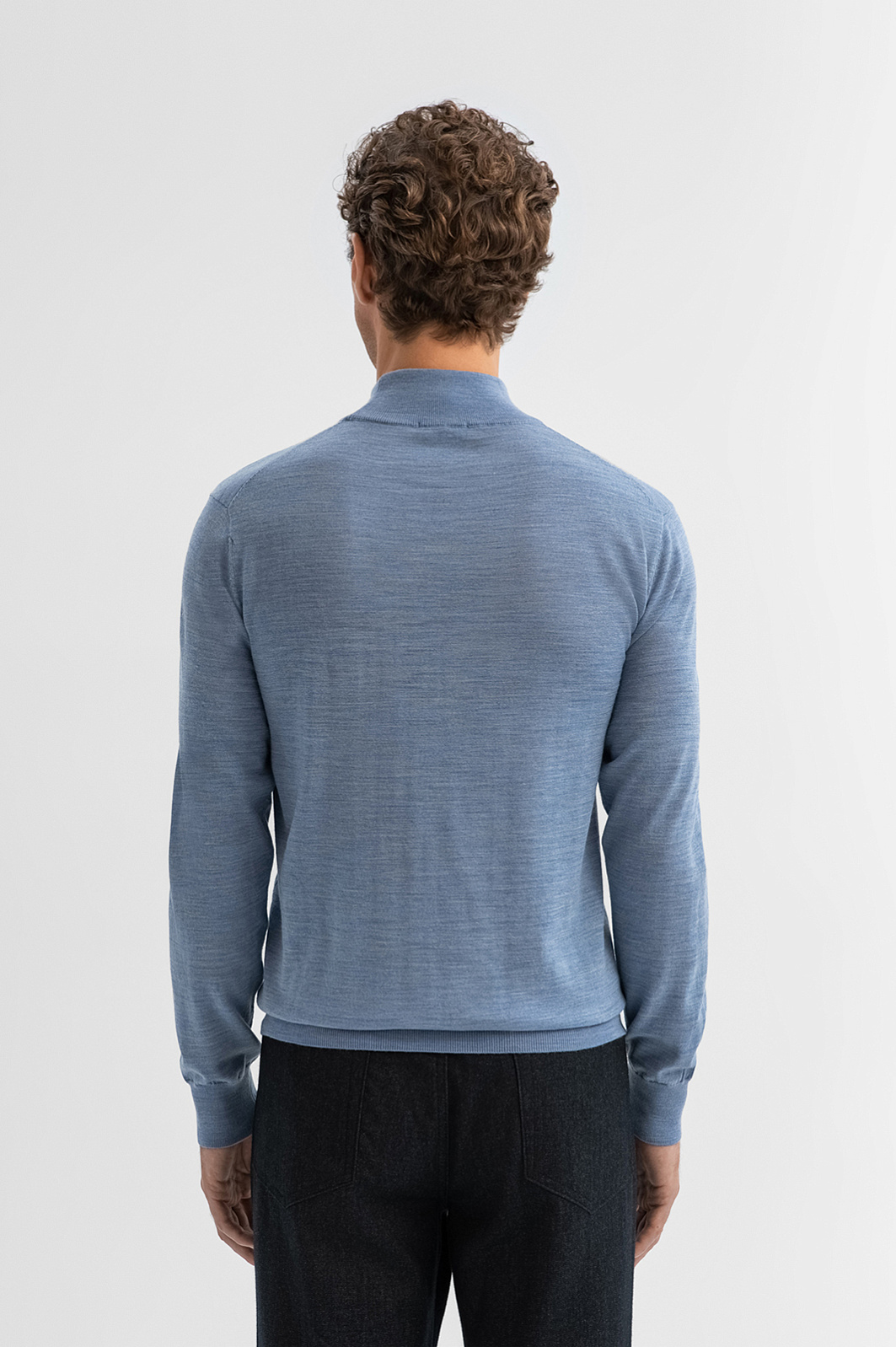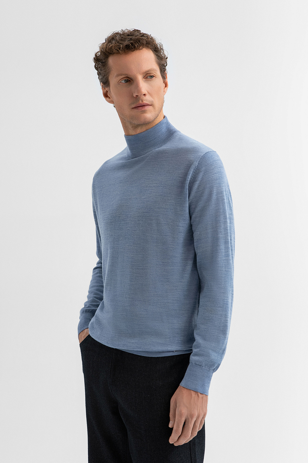 Водолазка KANZLER из 100% шерсти — сочетание классики и приятного цветового акцента. Небесно-голубой оттенок легко впишется в гардероб, освежая строгие образы и придавая им индивидуальность. Трикотажные резинки на воротнике, рукавах и по низу создают аккуратный силуэт и защищают от холода. Лёгкий меланжевый эффект добавляет визуальной текстуры и делает водолазку еще более интересной вблизи. Натуральная шерсть дарит тепло, мягкость и комфорт, оставаясь воздухопроницаемой и приятной к телу даже при длительной носке. Параметры модели: рост 188, 97-82-92 Размер на модели: M